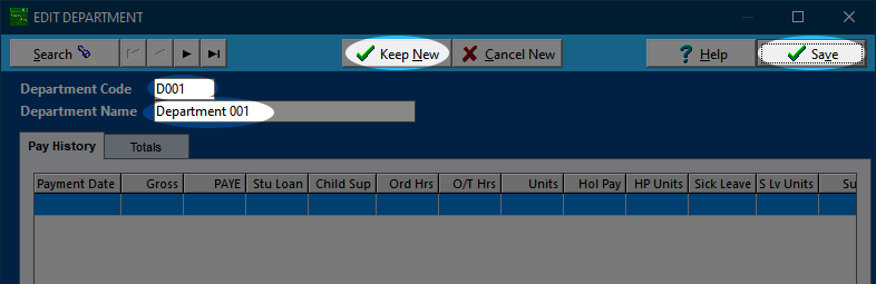 A blank record will appear. You can enter a code for the department of up to four characters, and a name. The code cannot be changed later, but the name can be changed at any time.