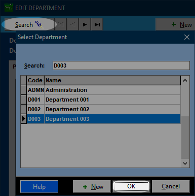 Select the department from the list which appears when you first enter this option, or click Search to locate the department you wish to alter. You can type in the code and press enter (on your keyboard), or select from the list and click OK, or just double click the required department directly in the list.
