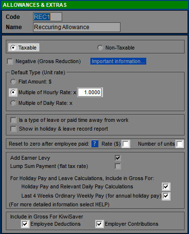 Here's an example of a taxable allowance which is to be paid each pay at amount related to the employees main hourly rate. It has the unimaginative name of "recurring allowance". Note in particular the Default Type (Multiple of Hourly rate x 1), and Reset to zero (both options cleared). It's a regular payment and non-discretionary, so the Holiday Pay options are selected. It's a taxable allowance, so as with almost all gross pay types, will be included in the KiwiSaver calculations - Include in Gross For KiwiSaver.