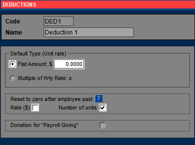 Here's an example of a deduction which is paid periodically, where the amount is to remain the same, but the number of units are set to zero after each pay so that it is not accidentally deducted each pay. Note in particular Reset to zero - only Number of units is cleared.