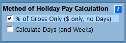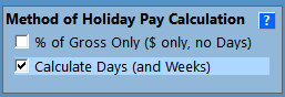 For example, for casual employees % of Gross Only is used, and for permanent employees Calculate Days (and Weeks) is used. These examples assume holiday pay in days - if you are using hours, then the word "Hours" will appear instead of "Days".