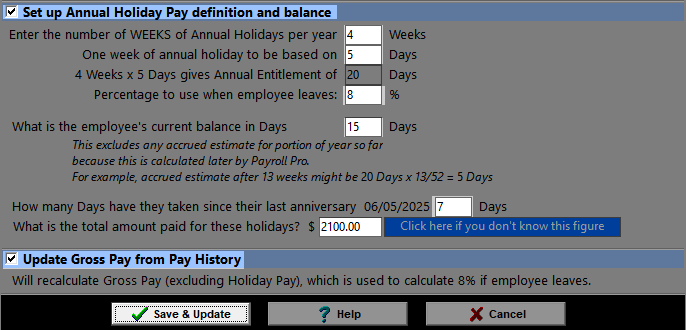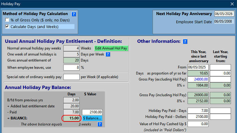 The other column, This Year, since last anniversary, is primarily to enable the calculation of 8% of gross pay should the employee finish employment before their next anniversary. In the above example, if the employee finished employment right now, they would receive the 15 days balance at the value prescribed by the Holiday Act, plus 8% of that value. Let's say each day is worth $300, then they would receive $4,500 plus $460 for those days. On top of this, they would receive $2152, which is 8% of all other gross pay since their last anniversary date. You can have a look at the Holidays Act, in particular, Sections 24 to 26 here for more information.