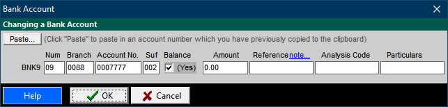 Alternatively, the Paste... button can be used if you have copied a full bank account number to the Windows clipboard. Various formats are accepted (with or without leading zeros), as long as each of the sections is separated with a sash or space. For example, the above result would be achieved with the following (if the account were valid, which it is not)
