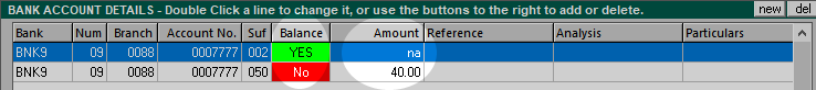 For an employee with a single bank account, enter the account (Num, Branch, Account No and Suf), and tick Balance. The amount will be zero as it is not applicable (all net pay will go into the account).