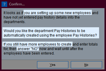 If you do not have any department totals currently, Payroll Pro will ask you if you want to have these calculated from the employee totals. Answer Yes if all employees have been entered, or No if you are coming back to enter some more.